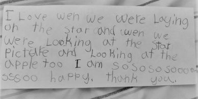 I loved when we were laying on the star and when we where looking at the star picture and looking at the apple too. I am so so so so happy. Thank You